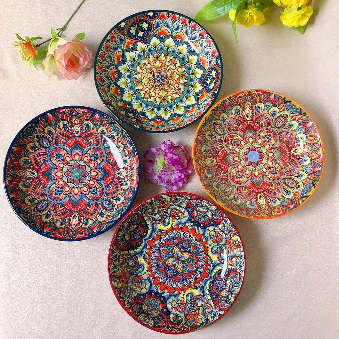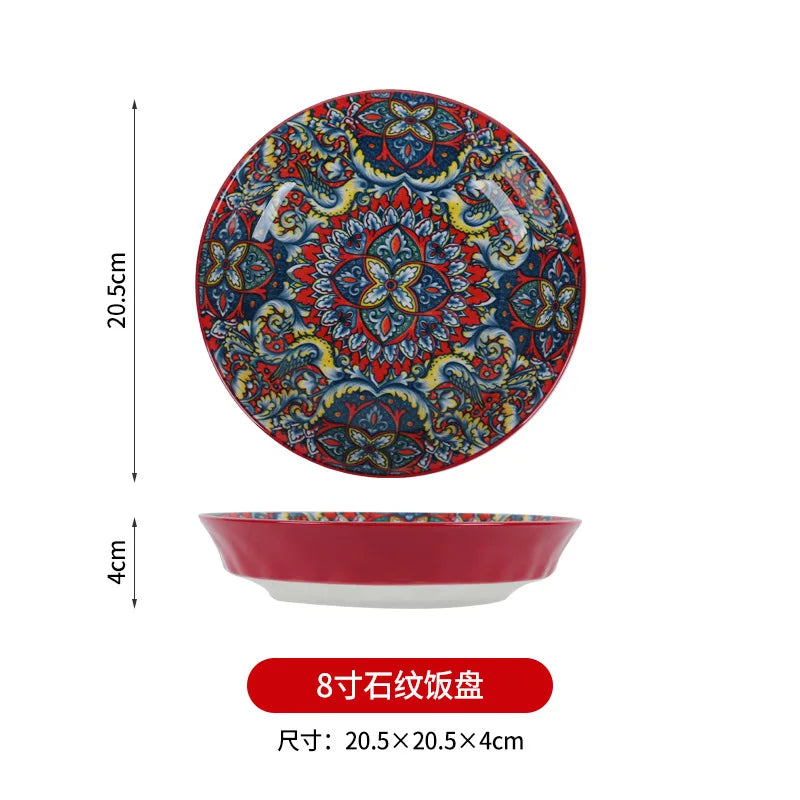 8inch Bohemian Ceramic Western Steak Plate Vintage Dinnerware Set Floral Design Home Restaurant Fruit Plate Bowl Dinner Plate