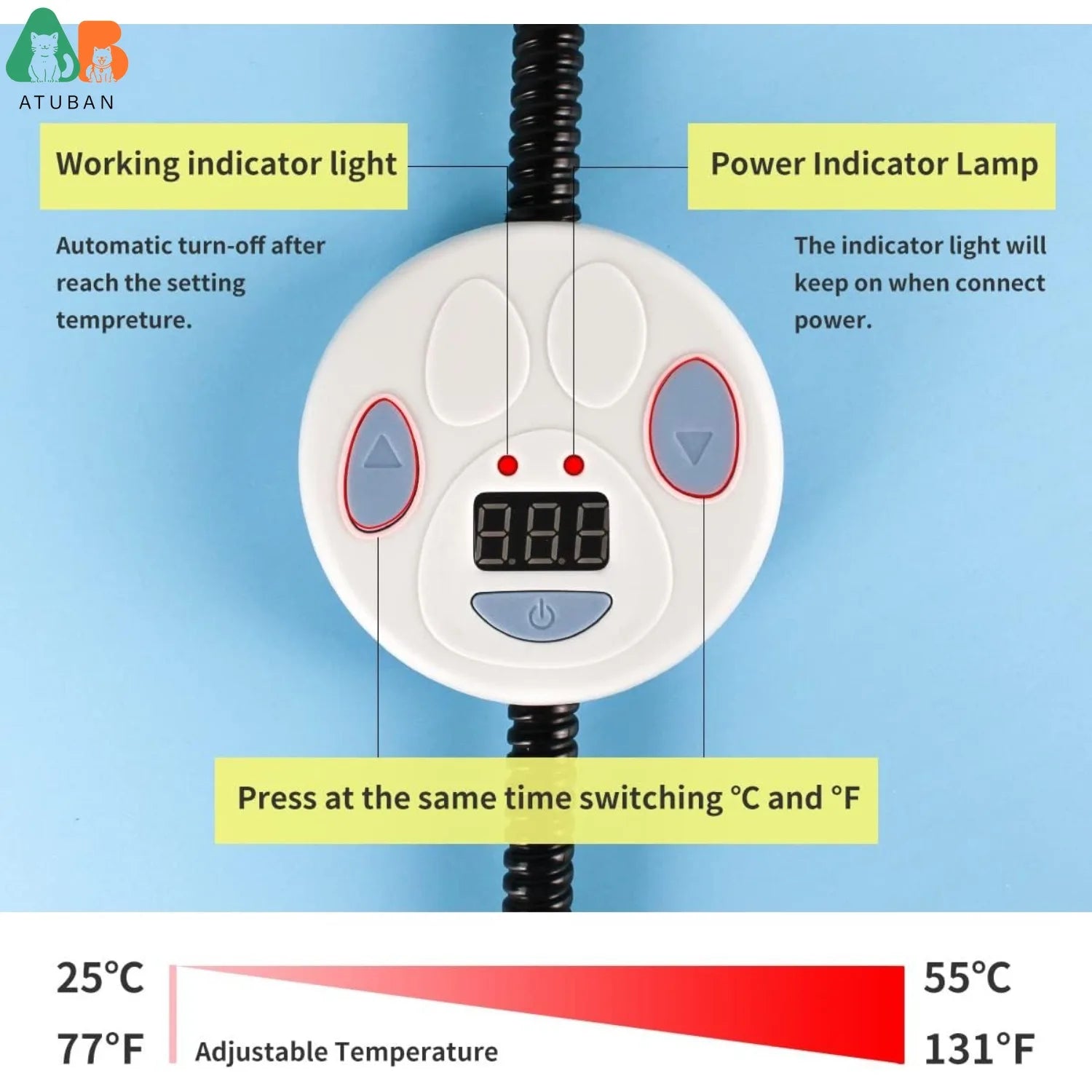 - 7 levels of temperature adjustable from 75 ℉-135℉(25℃ - 55℃), 2 modes of Fahrenheit and Celsius can be exchanged when pressing left and right adjustment keys at the same time, the display will show ℉ or ℃. Pets' body temperature is about 98 ℉, veterinarians advise 95-113℉ is the most comfortable temperature for pets in winter. 104℉ is recommended.