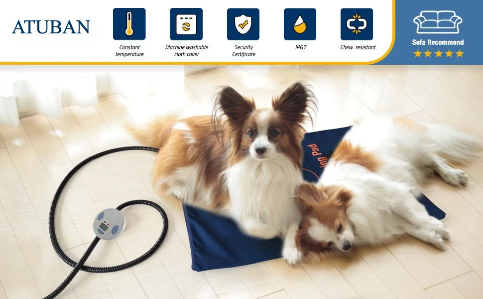 - Dog heating pad certified with UL, IP67 waterproof PVC inner surface, removable & washable polyester cover, anti-overheating, about 80" anti-bite spiral cable tube, you can always use it daily with confidence.