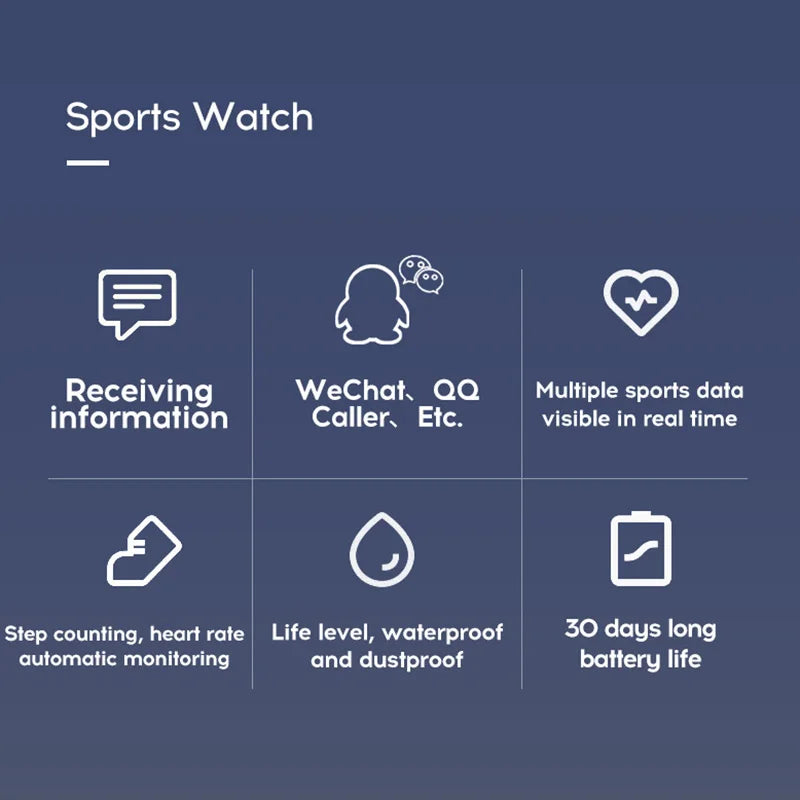 The watch can monitor the steps, calories, heart rate, distance, sleep quality, etc. Of the day. At the same time, it can connected to a smart phone to view information, remotely take pictures, retrieve mobile phones and other thoughtful and convenient functions to make your life more convenient.