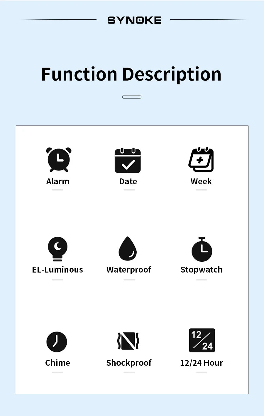 8.Function: chrono,alarm,week,date,LED light,12/24 hour clock