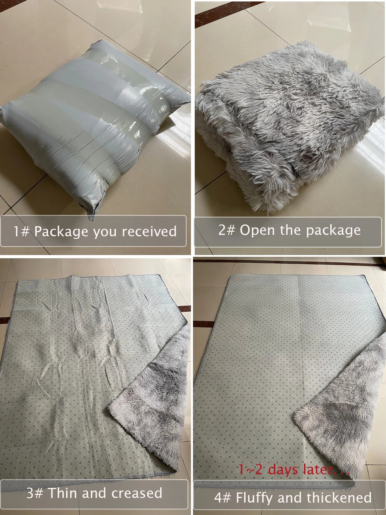 A:Since this rug comes with a vacuum Packaging bag,it’s normal to see the fibers on the rug is not fluffy enough and there will be some creases. Please lay it flat for 3 days and wait patiently for its recovery.Please do not worry about this situation.