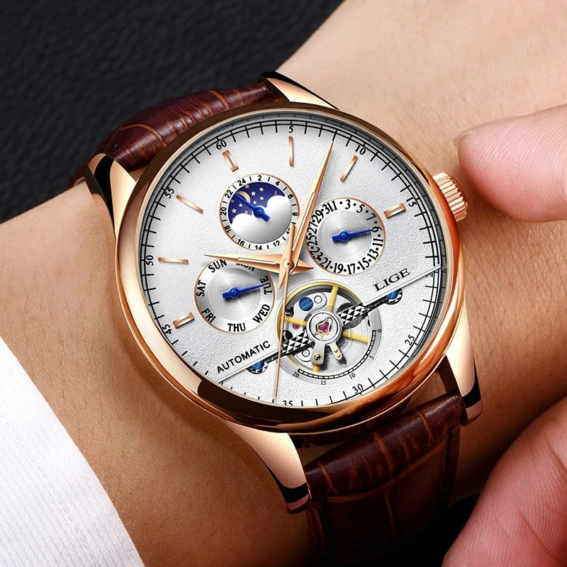 New LIGE Tourbillon Watches 50M Waterproof Men Mechanical Watches Automatic Wrist Watches Date Week Clock Gift Relogio Masculino