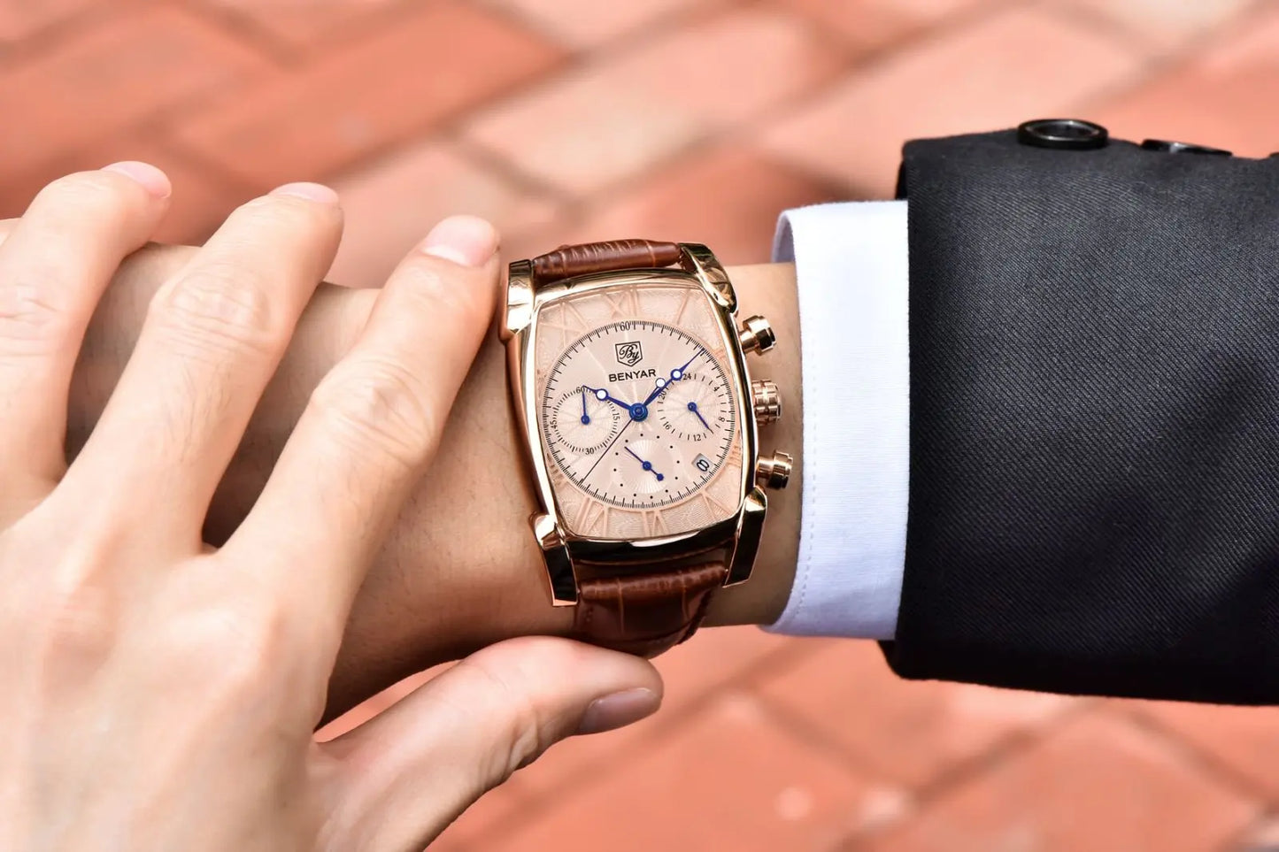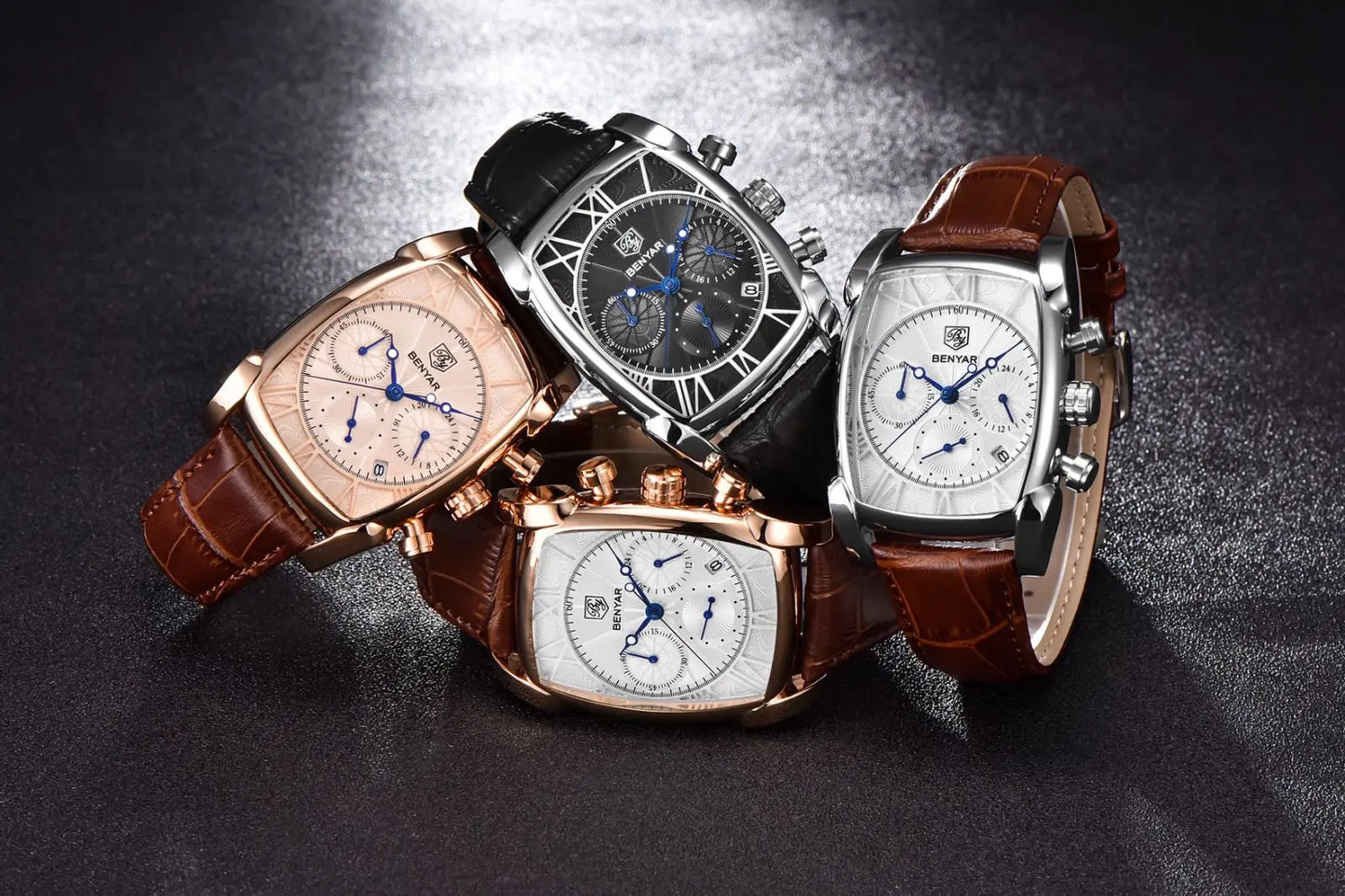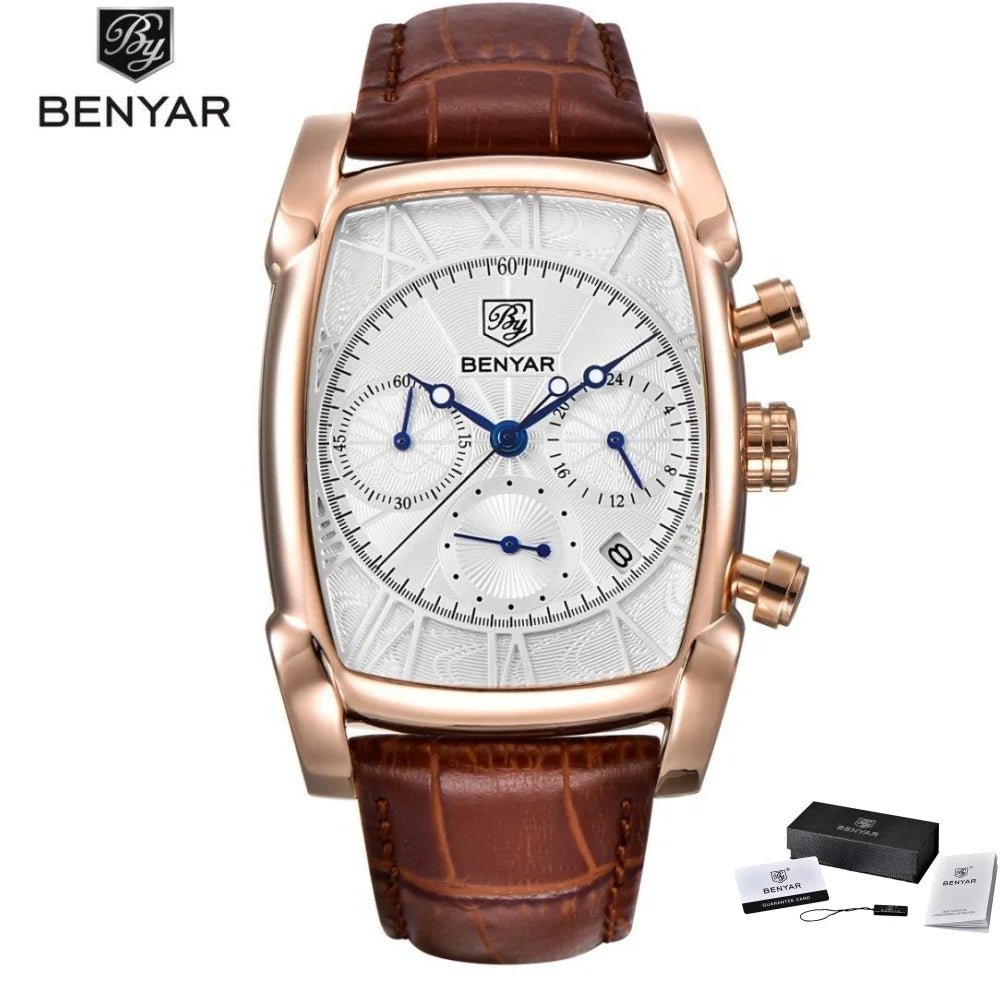 Relogio Masculino Mens Watches Top Luxury Brand BENYAR Chronograph Leather Quartz Watch Men Military Sport Rectangle Wristwatch